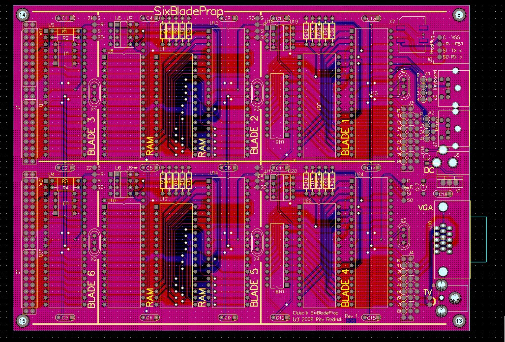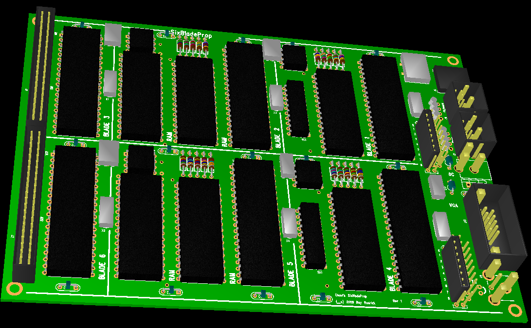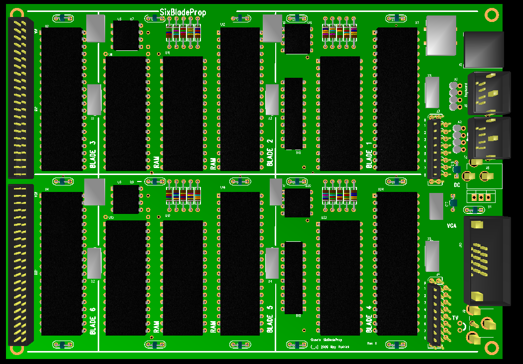 Home of Cluso's MultiBladePropsSingle Board Computer using multiple Parallax Propeller Microprocessor chipsSixBladeProp PCBThe SixBladeProp PC was designed to use 6 Parallax Propeller Microprocessor chips. It has been replaced with the more functional TriBladeProp PCB, which can be stacked, or be purchased in panels of up to 5 TriBladeProp PCBs. SixBladeProp PCB
